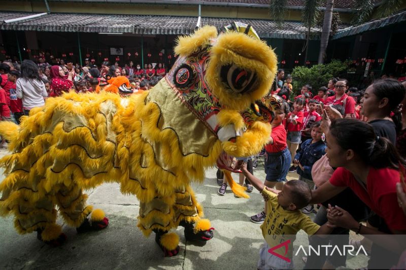 Siswa memberi angpao kepada barongsai usai beratraksi menghibur siswa di SD Warga, Solo, Jawa Tengah, Jumat (2/2/2024). Atraksi barongsai tersebut untuk memperkenalkan kesenian dan budaya Tionghoa kepada para siswa serta menyambut Tahun Baru Imlek. Warga Berita FOTO/Mohammad Ayudha/tom.