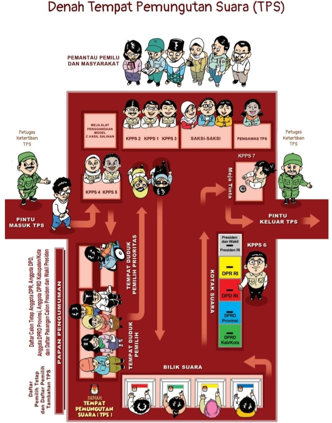– Memasuki pintu masuk TPS yang dijaga petugas ketertiban TPS berseragam hijau. Petugas KPPS 4 dan 5 yang duduk di dekat pintu masuk akan menerima pemilih dan memeriksa Model C6 (Surat Pemberitahuan Pemungutan Suara) yang dibawa pemilih dan mencocokan dengan DPT, DPTb atau DPK.