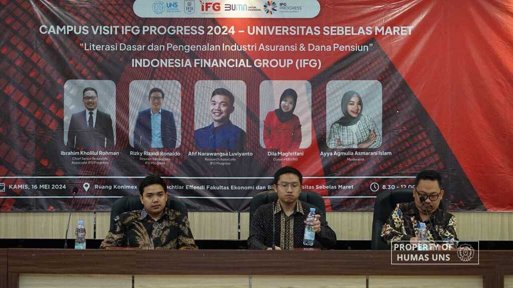 UNS – Universitas Sebelas Maret (UNS) Surakarta menjadi tujuan kegiatan Campus Visit IFG Progress 2024, Kamis (16/5/2024). Indonesia Financial Grup (IFG) hadir di Fakultas Ekonomi dan Bisnis (FEB) UNS dengan mengadakan seminar bagi sivitas akademika yang hadir. Seminar ini mengangkat topik menarik yaitu “Literasi Dasar dan Pengenalan Industri Asuransi & Dana Pensiun”.