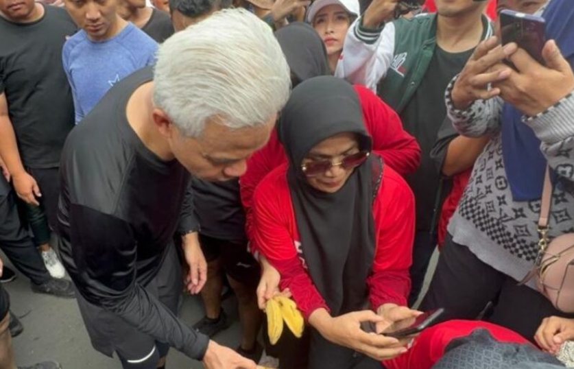 “Ini, satu-satu ya. Satu-satu, ” ucap Ganjar memberikan pisang rebus.