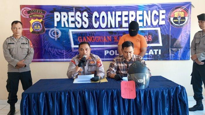 Kapolsek Mlati Kompol Irwiantoro didampingi Kanit Reskrim AKP Pujiono menunjukkan pelaku AS alias Kenting yang ditangkap atas kasus pencurian sepeda motor di Mlati, Kabupaten Sleman | tribunnews