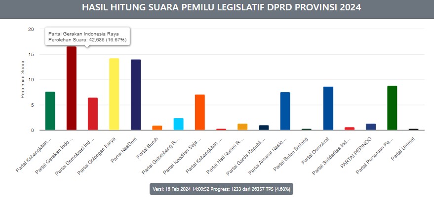 Perolehan suara Gerindra pada pukul 15.17 Wita, Jumat (16/2/2024), mencapai 42,097 suara atau sekitar 16,76 persen.