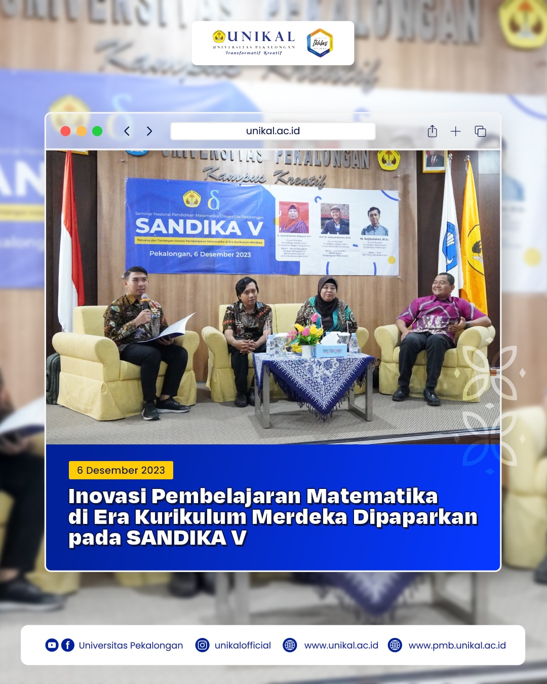 Universitas Pekalongan – Program studi (prodi) Pendidikan Matematika, Fakultas Keguruan dan Ilmu Pendidikan (FKIP) Universitas Pekalongan (Unikal) kembali menyelenggarakan “Seminar Nasional Pendidikan Matematika Universitas Pekalongan (Sandika 5) di Auditorium Adaro Gedung F Universitas Pekalongan (Unikal), Rabu (6/12). Sandika 5 bertema “Peluang dan Tantangan Inovasi Pembelajaran Matematika di Era Kurikulum Merdeka”. Dalam pembukaan Sandika V turut hadir Rektor Universitas Pekalongan, Andi Kushermanto, S.E., M.M, jajaran wakil rektor dan jajaran dekan di lingkungan Unikal.