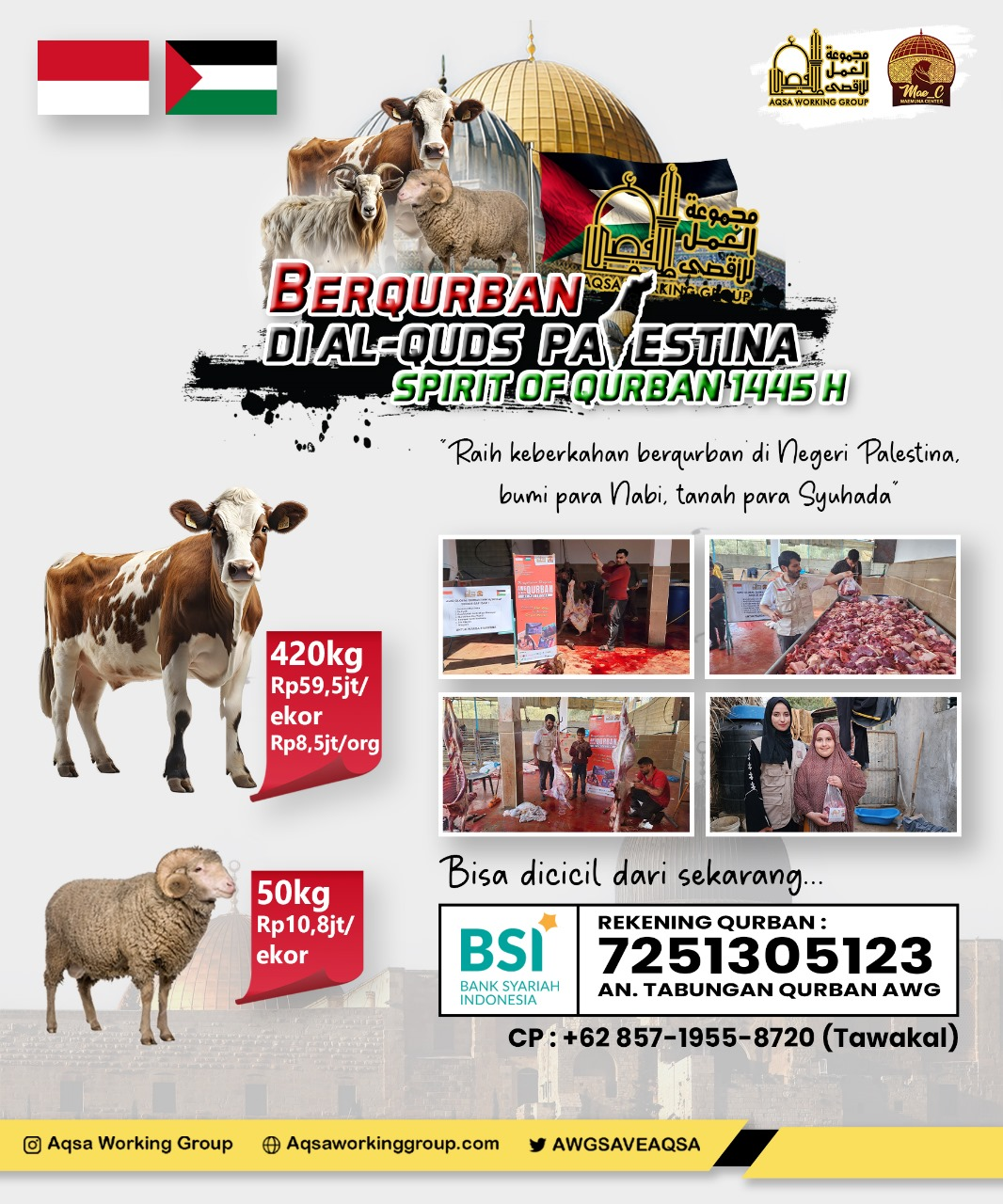 “Hari Raya Idul Adha 1445 sebentar lagi… Mari bersama meraih keberkahan berqurban di Negeri Palestina, Bumi Para Nabi, Tanah Para Syuhada,” bunyi caption di akun Instagram @aqsaworkinggroup.