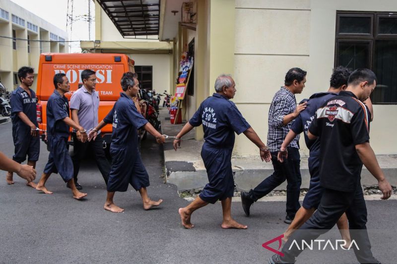 Petugas mengawal sejumlah tersangka yang dihadirkan saat rilis pengungkapan kasus penyelundupan ratusan anjing di Polrestabes Kota Semarang, Jawa Tengah, Rabu (10/1/2024). Polrestabes Semarang mengamankan lima tersangka kasus penyelundupan 226 ekor anjing yang akan diedarkan ke sejumlah wilayah di Jawa Tengah untuk daging konsumsi sehingga mereka dikenakan pasal 302 KUHP dan 55 KUHP tentang penyiksaan hewan dengan ancaman hukuman maksimal sembilan tahun penjara. Warga Berita FOTO/Makna Zaezar/tom.