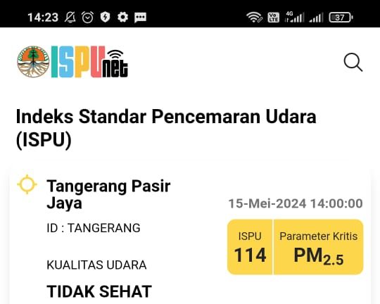 Dimana tingkat pencemaran udara di Kota Tangerang mencapai angka 114. Lebih tunggi dari wilayah Kabupaten Tangerang (69) dan Tangsel (92).