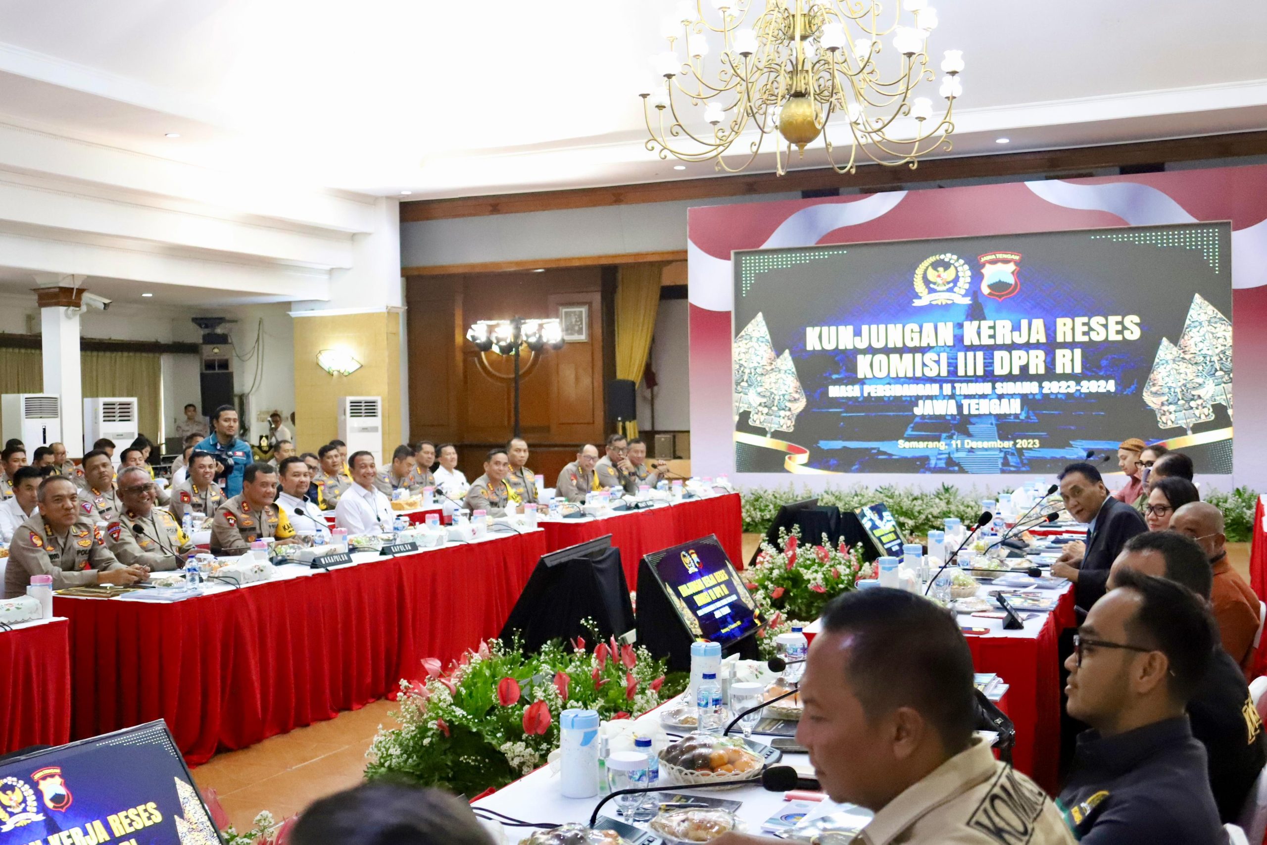 SEMARANG – Polda Jateng|Rombongan komisi III DPR RI yang dipimpin Ir Bambang Wuryanto, mengunjungi Polda Jawa Tengah dalam rangka Kunjungan Kerja Reses Masa Persidangan II Tahun Sidang 2023/2024. Dalam kunjungan itu, rombongan para wakil rakyat tersebut mengadakan pertemuan dengan Kapolda Jateng , Irjen Pol Ahmad Luthfi serta Kepala BNN Provinsi Jateng, Brigjen Pol Agus Rohmat didampingi para pejabat utama kedua instansi di gedung Borobudur Mapolda Jateng, Senin (11/12/2023)