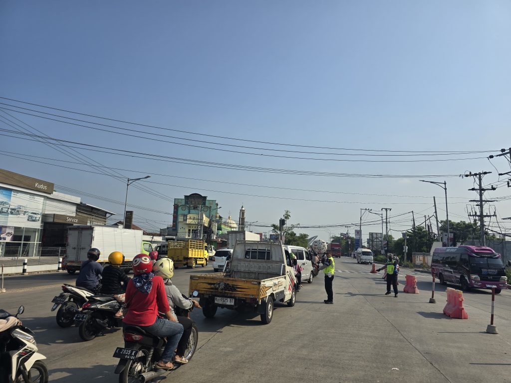 Kudus – Satlantas Polres Kudus memberlakukan sistem contraflow untuk mengurai kemacetan di perbatasan Kudus arah Demak, atau di sekitar Jembatan Tanggulangin, Kamis (6/6/2024).