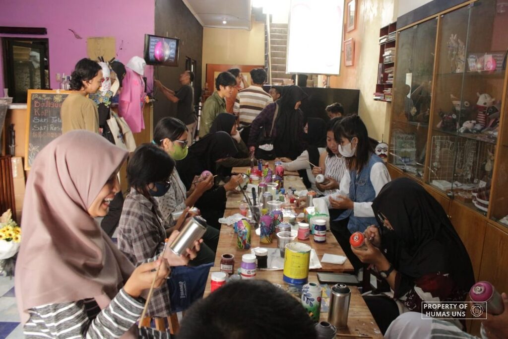 UNS — Mahasiswa Fakultas Seni Rupa dan Desain (FSRD) Universitas Sebelas Maret (UNS) Surakarta menggelar Art Class Painting Can. Mereka merupakan kelompok Merdeka Belajar Kampus Merdeka (MBKM) Sekelas yang dibimbing oleh Dyah Yuni Kurniawati, S.Sn., M.Sn. Kegiatan ini menjadi bagian dari program magang para mahasiswa di Solo is Solo.
