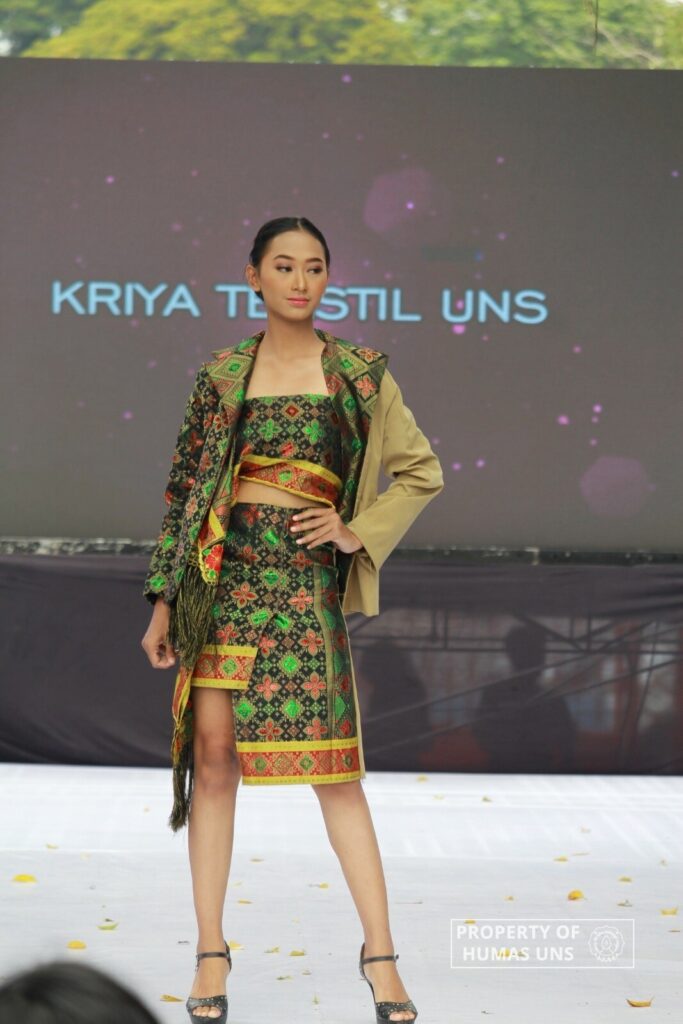 Para mahasiswa menampilkan karya-karya fashion kreatif yang berwawasan budaya dan lingkungan. Desain tekstil dan fashion yang berwawasan budaya dan lingkungan merupakan dasar nilai yang dikembangkan oleh prodi Kriya Seni UNS. Mahasiswa yang berpartisipasi dalam acara ini diantaranya Anggie Karunia Rahma, Annisa Tri Syahri Chiquitana Balqis Ghorra’ul Wajh, Derrick Ananditya, Erlitna Justita Br. Purba, Kharisma Widya Kartika, Mufida Khairul Muna, Muhammad Rifqi Hasya, Salva Rusnia Ardhiyanie, Tery Luana Irmalia, dan Yosevin Tiodora.