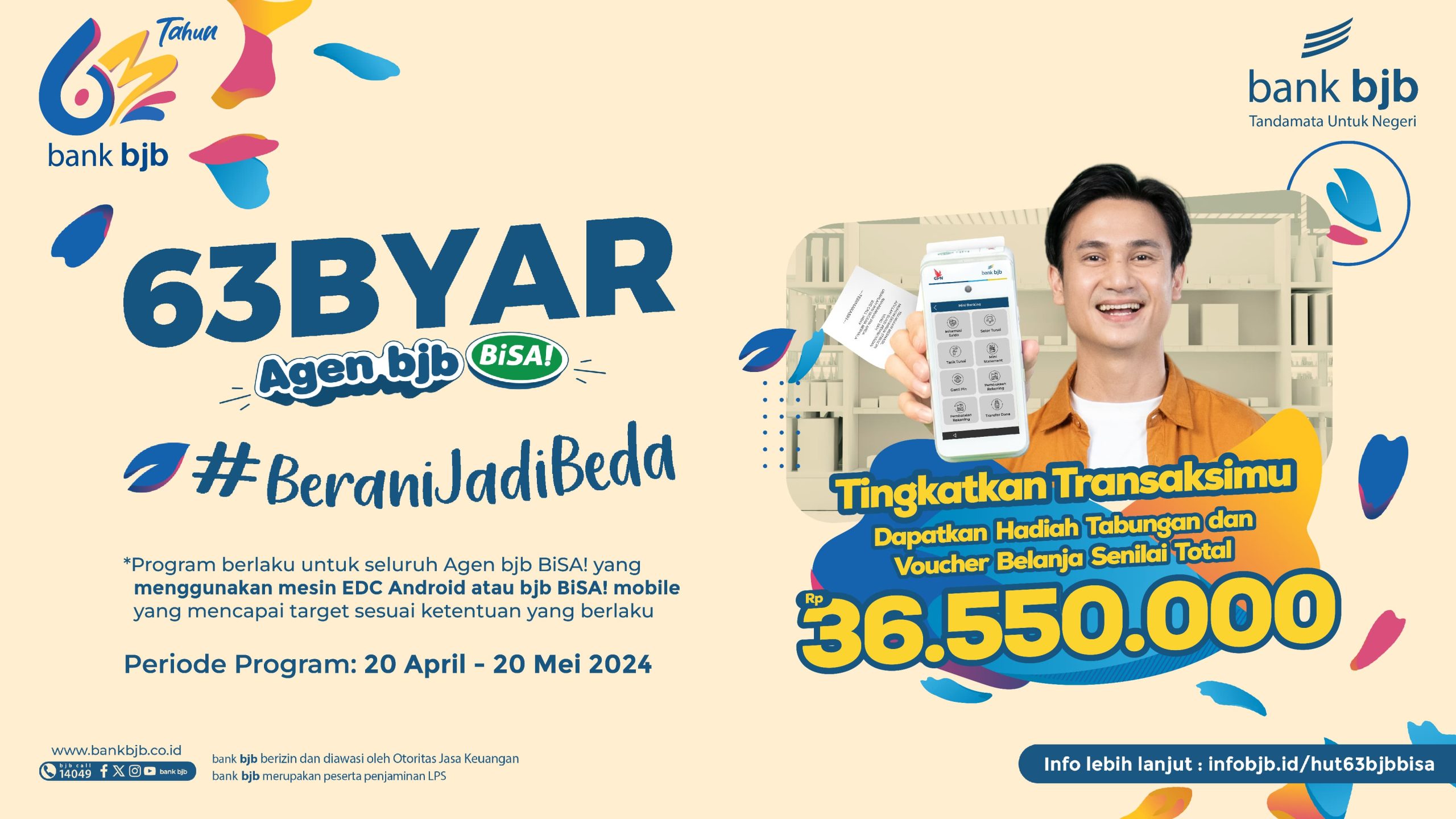 Nah, untuk memacu kinerja transaksi melalui agen, sekaligus menyambut momen ulang tahun ke-63, bank bjb menyelenggarakan Program Gebyar Agen bjb BiSA! yang dimaksudkan untuk meningkatkan utilisasi transaksi bagi seluruh Agen bjb BiSA! aktif berupa pemberian reward sesuai dengan transaksi yang diperhitungkan berdasarkan kategori dan ketentuan program.