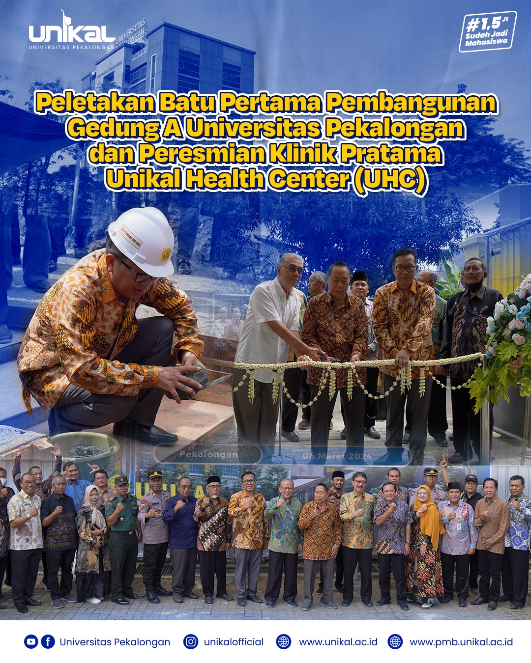 Universitas Pekalongan – Peletakan batu pertama pembangunan gedung A dilaksanakan pada Rabu (6/3). Acara berlangsung di halaman pembangunan gedung A. Turut hadir jajaran pembina dan pengurus yayasan Samarthya, jajaran pimpinan di lingkungan Unikal, serta tamu undangan. Universitas Pekalongan berkomitmen untuk selalu meningkatkan mutu pendidikan, oleh karena dengan adanya pembangunan gedung A baru ini, nantinya mampu memberikan sarana dan prasarana perkuliahan yang optimal.
