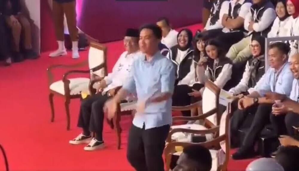 Pada saat itu, Gibran berdiri dari duduknya untuk membangkitkan semangat penonton setelah Prabowo membelanya soal putusan Mahkamah Konstitusi (MK).