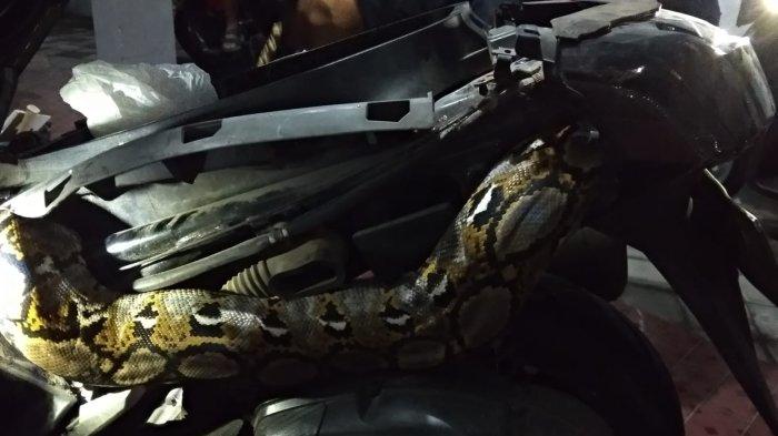 “Diperkirakan ular memasuki rumah pada malam setelah hujan lebat dan ingin bersembunyi pada rongga sepeda motor. Khawatir ular akan membahayakan, warga menghubungi Damkarmat,” terang Taokhid.