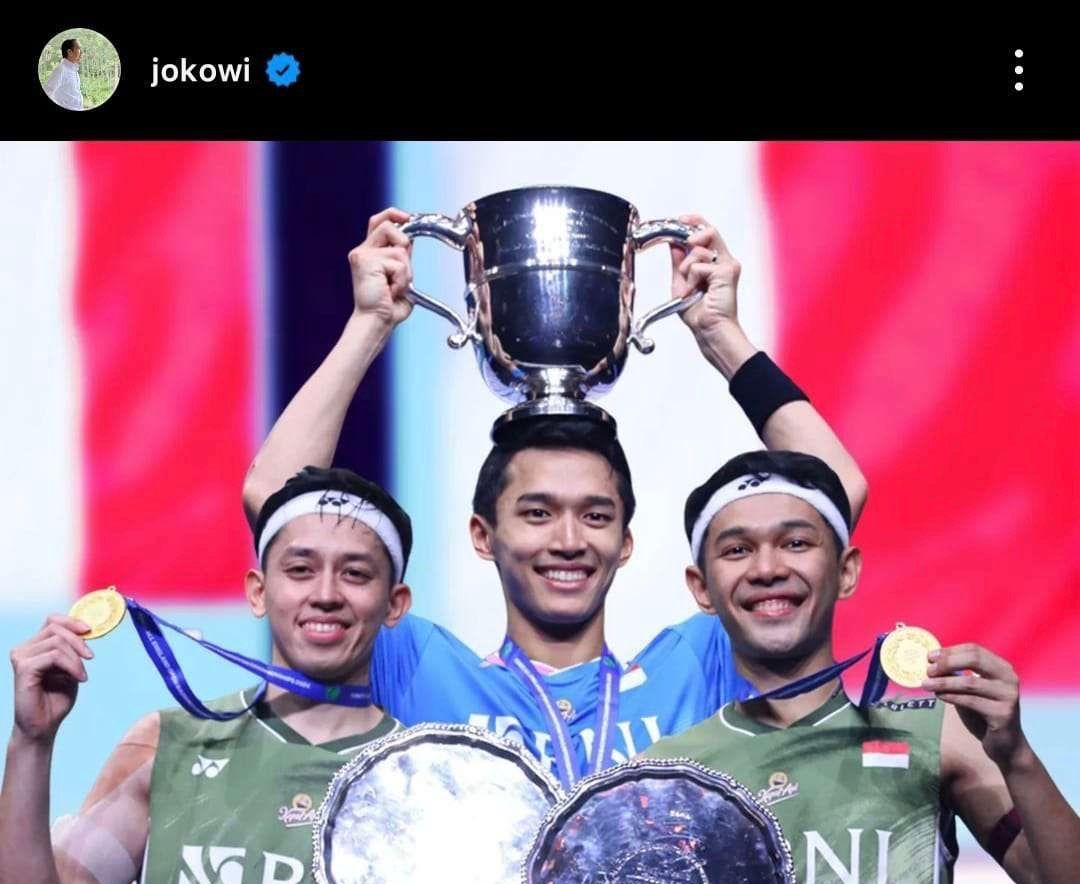 “Penantian panjang setelah 30 tahun menanti kemenangan hebat di sektor tunggal putra ajang turnamen bulutangkis bergengsi ini. Di sektor ganda putra, Indonesia kokoh mempertahankan gelar juara pertama swjak tahun 2022,” ucap Presiden.