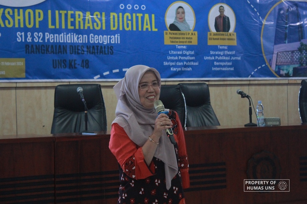 UNS – Program Studi (Prodi) S-1 dan S-2 Pendidikan Geografi Fakultas Keguruan dan Ilmu Pendidikan (FKIP) Universitas Sebelas Maret (UNS) Surakarta menyelenggarakan workshop literasi digital yang berfokus pada penulisan skripsi dan publikasi karya ilimah. Workshop ini dilaksanakan secara luring di Aula Lantai 3 Gedung G FKIP UNS dan secara daring melalui aplikasi Zoom Meeting pada Selasa (20/2/2024).