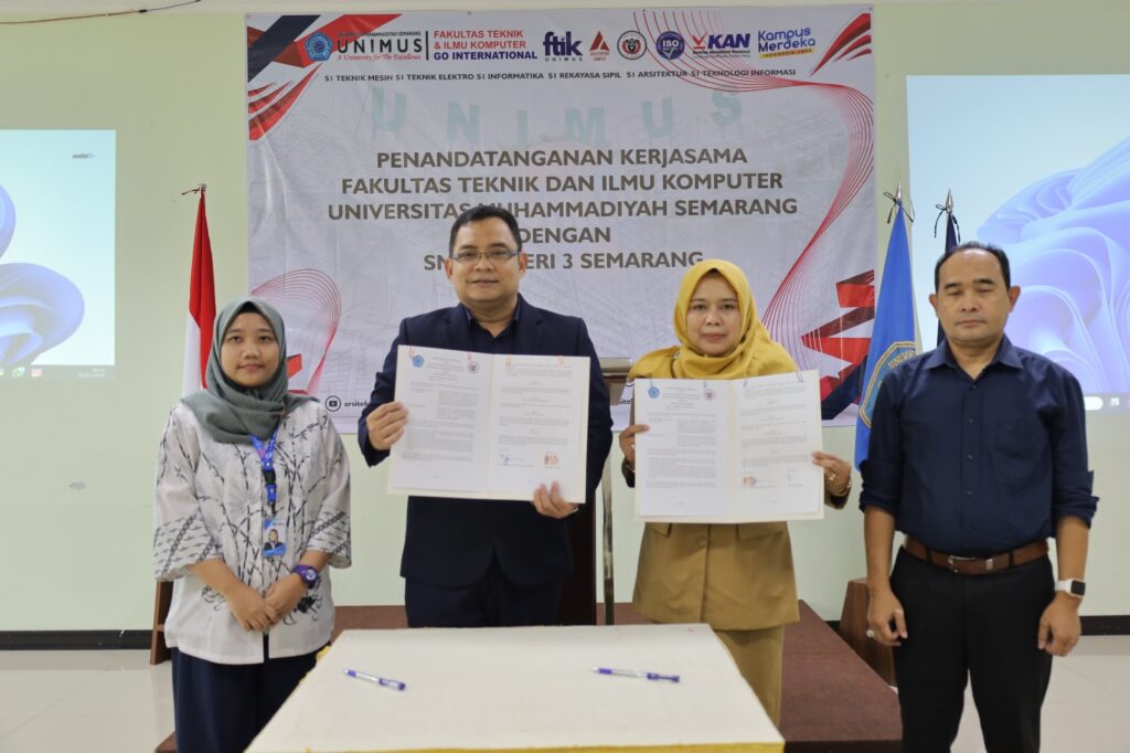 Semarang | Program Studi S1 Arsitektur Fakultas Teknik dan Ilmu Komputer (FTIK) Universitas Muhammadiyah Semarang (Unimus) menerima kunjungan dari Sekolah Menengah Kejuruan Negeri (SMKN) 3 Semarang, Senin (22/1/2024). Rombongan dari SMKN 3 Semarang yang terdiri dari Kepala Sekolah, Guru dan sebanyak 32 Siswa disambut langsung oleh Dekan FTIK (Dr. Ir. RM. Bagus Irawan, MT. IPM), beserta jajaran Pimpinan serta Dosen Arsitektur Unimus, bertempat di ruang 507 Gedung Kuliah Bersama (GKB) II.