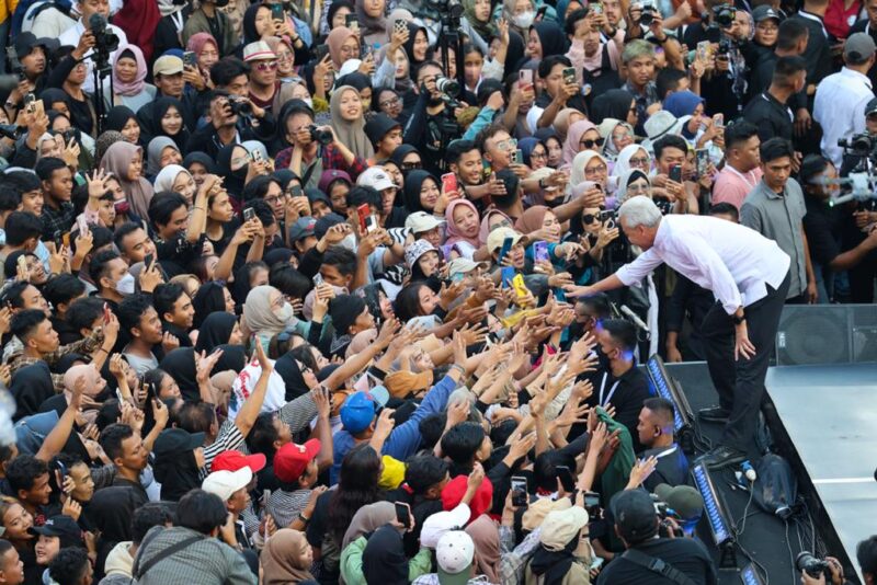 Lebih mengharukan lagi, Ganjar yang mengenakan kemeja putih itu tiba-tiba menuruni tangga panggung bagian depan, demi bisa menyalami ribuan orang warga yang hadir. Di tengah penuh sesak, Ganjar meraih tangan warga satu per satu sambil berjalan ratusan meter di Jalan Pahlawan.