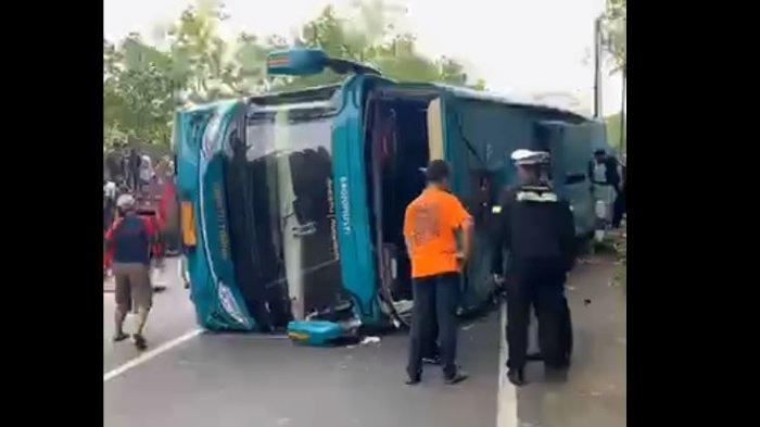 Bus kemudian hilang kendali hingga akhirnya terguling ke sisi kiri jalan. Satu penumpang bus tewas dalam kecelakaan itu setelah tergencet bodi bus.