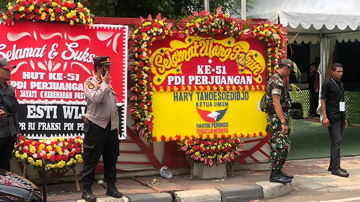 Sebagaimana terlihat, sejumlah karangan bunga ucapan Hari Ulang Tahun ke-51 PDIP berjejer di depan Gedung Sekolah Partai di pinggir Jalan Raya Lenteng Agung Raya, Jakarta Selatan, Rabu (10/1/2024).