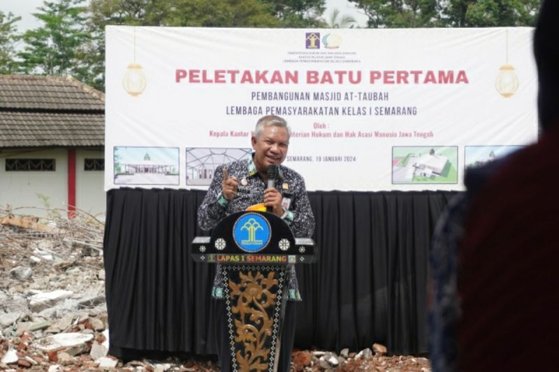 Tampak mendampingi prosesi peletakan batu pertama Masjid At-Taubah, Kepala Divisi Pemasyarakatan Kadiyono, Kepala Lapas Kelas I Semarang Usman Madjid, Pejabat struktural, dan santri Lapas. ***