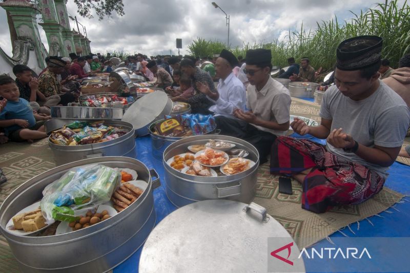 Warga berdoa bersama saat tradisi Sadranan di Sidorejo, Ginting, Cepogo, Boyolali, Jawa Tengah, Rabu (28/2/2024). Tradisi Sadranan yang telah dilakukan secara telah turun temurun itu diikuti warga dari berbagai keyakinan untuk bersama-sama mendoakan para leluhur yang telah meninggal dunia agar terwujud kebersamaan dan persaudaraan yang kuat. Warga Berita FOTO/Aloysius Jarot Nugroho/tom.