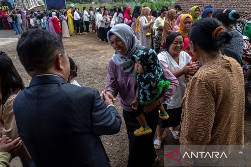 Warga bersalaman saat mengikuti acara silaturahim lintas agama dengan umat Kristen dalam perayaan Natal di Dusun Tekelan, Desa Batur, Getasan, Kabupaten Semarang, Jawa Tengah, Senin (25/12/2023). Tradisi silaturahim warga lintas agama dengan mengunjungi tempat ibadah agama yang sedang merayakan hari besar keagamaan itu disertai dengan bersalaman saling memaafkan untuk memupuk kerukunan antarumat beragama dalam bingkai keberagaman Negara Kesatuan Republik Indonesia. Warga Berita FOTO/Aji Styawan/tom.