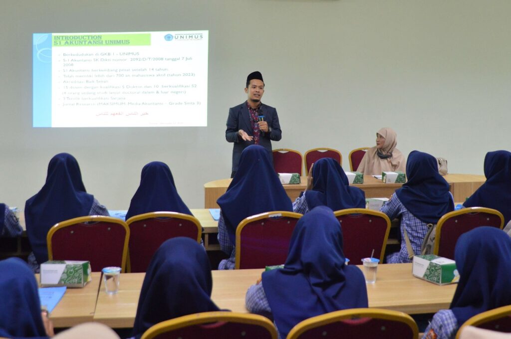 Seluruh siswa siswi SMK Muhammadiyah 4 Sukorejo menerima presentasi tentang profil Unimus yang disampaikan oleh Ns. Arief Yanto, M.Kep dan dilanjutkan presentasi oleh perwakilan Program Studi S1 Akuntansi Mohammad Ridwan, S.E., M.Ak., Ak. yang linier dengan jurusan siswa SMK Muhammadiyah 4 Sukorejo yaitu Akuntansi. M Ridwan menjelaskan tentang keunggulan yang dimiliki oleh program studi S1 Akuntansi. harapannya siswa dapat terbuka wawasannya untuk mengembangkan keahlian yang dikuasai dengan melanjutkan pendidikan di Unimus nantinya.