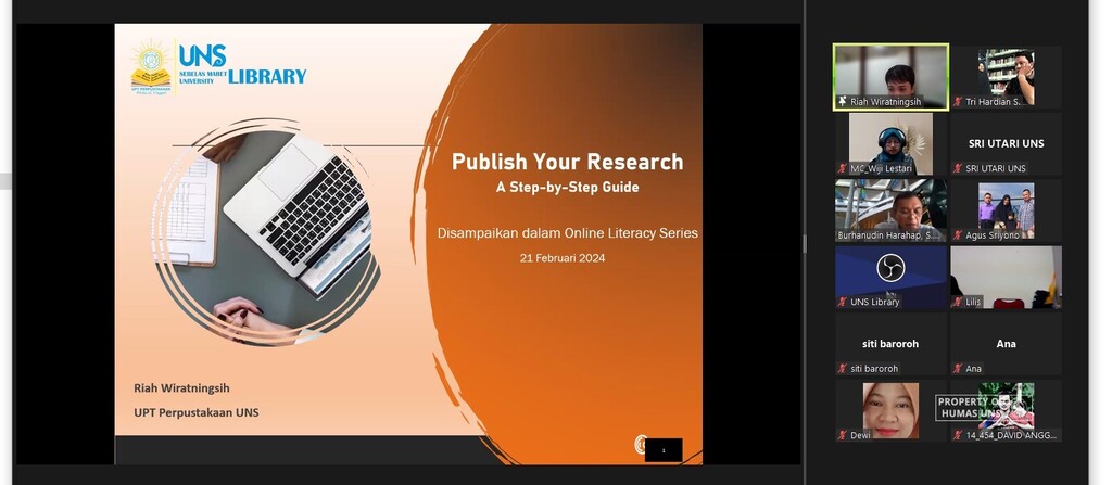 UNS — UPT Perpustakaan Universitas Sebelas Maret (UNS) Surakarta menyelenggarakan webinar online literacy series 2024. Kegiatan webinar ini merupakan serangkaian kegiatan yang dilaksanakan secara berseri dengan tema yang berbeda-beda di setiap serinya. Pada seri pertama ini disampaikan bagaimana menentukan topik penelitian sampai dengan persiapan publikasi pada jurnal ilmiah bereputasi. Webinar diselenggarakan secara daring melalui aplikasi Zoom Meeting.