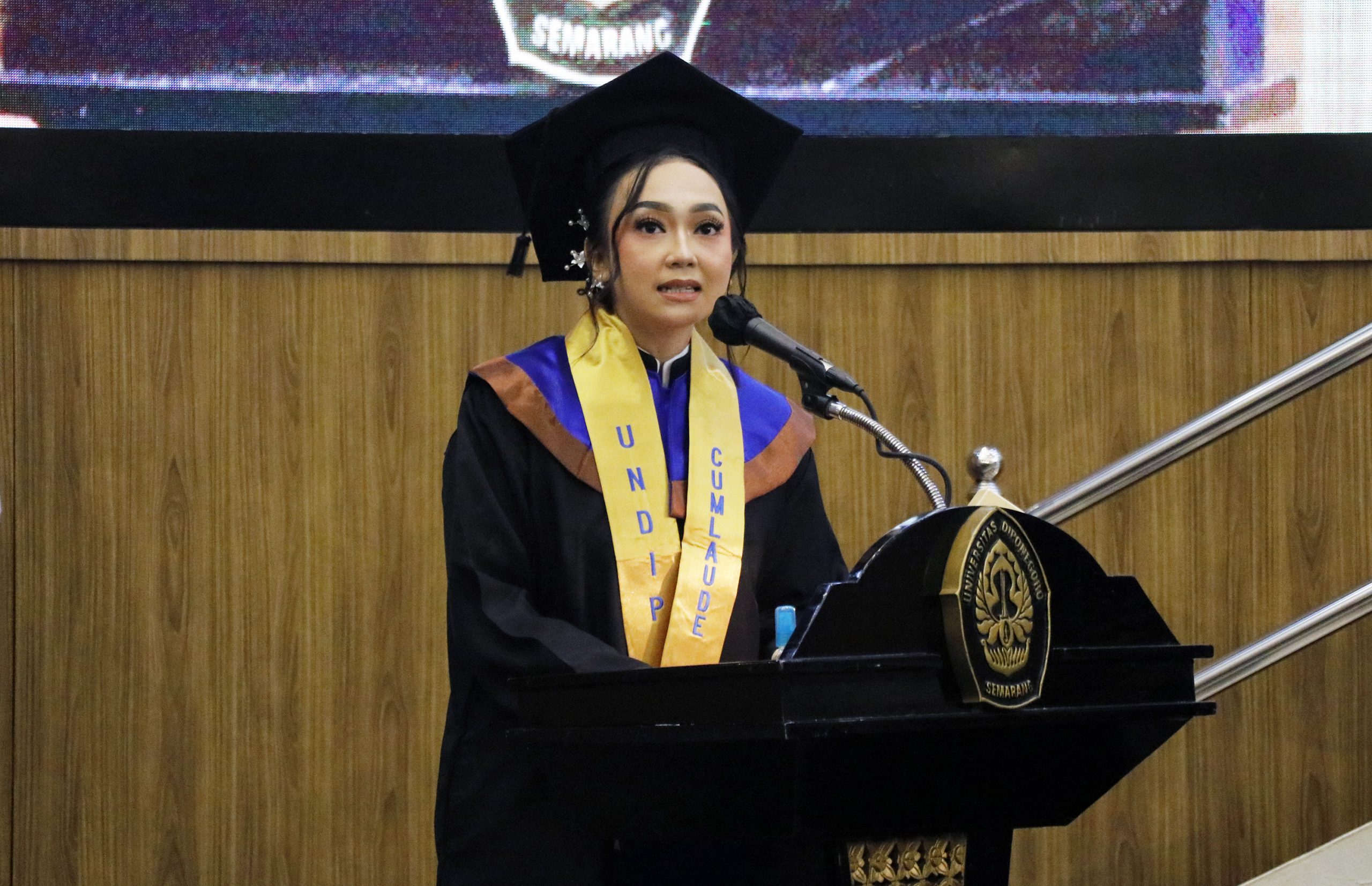 “Jadilah agent of change dengan ilmu, keterampilan, dan pengalaman yang sudah kita dapatkan di bangku perkuliahan. Sebagai mahasiswa, akademik saja tidak cukup, aktif dalam kegiatan kampus dapat melatih softskill bahkan memperoleh relasi yang luas dengan orang lain”, kata Rahel Nathania Prasasti, wisudawan periode 173 lulus peraih predikat summa cumlaude peroleh IPK 4,00 dengan masa studi 3 tahun 1 bulan pada program studi S-1 Teknologi Pangan, Fakultas Peternakan dan Pertanian Universitas Diponegoro (Undip).